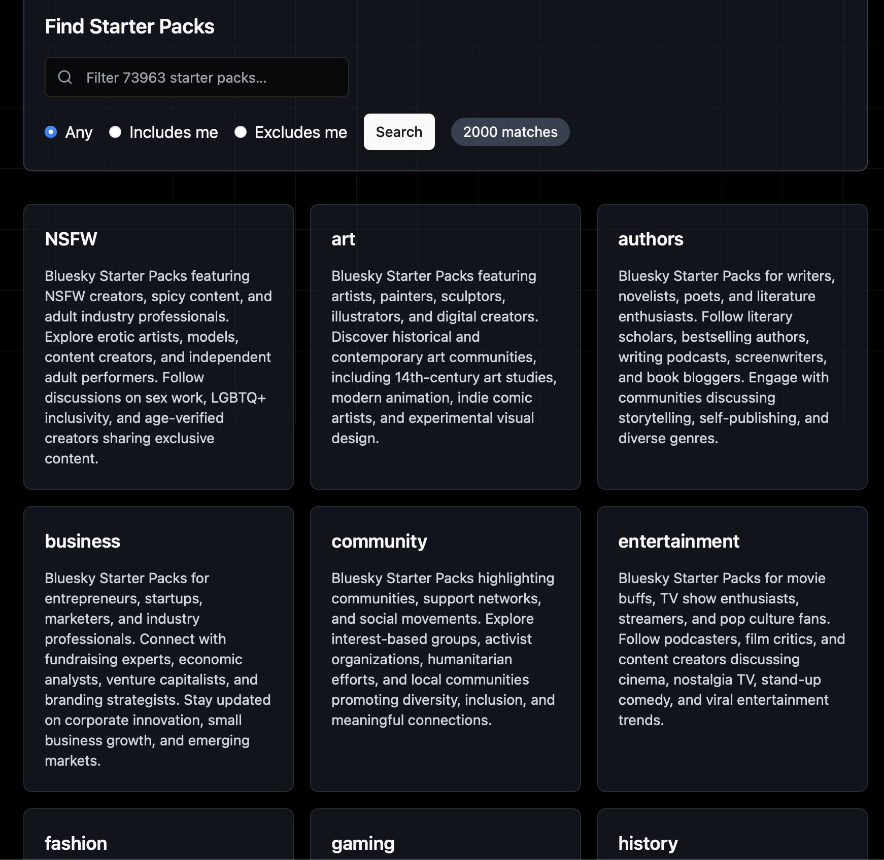 Check out the Bluesky Directory: Find starter packs tailored to specific topics.
