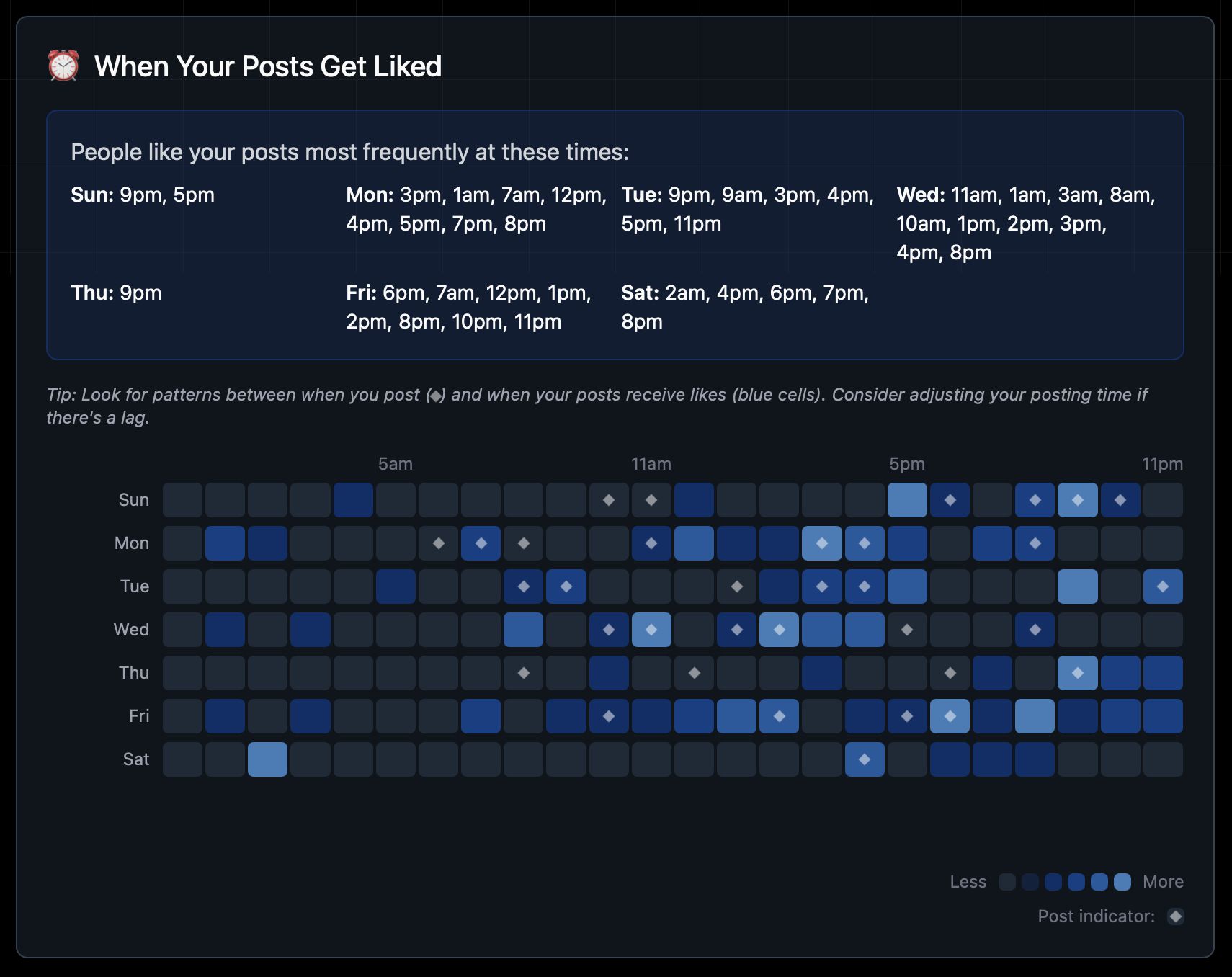 Analyze post performance: Check which times get the most likes, replies, and reposts.